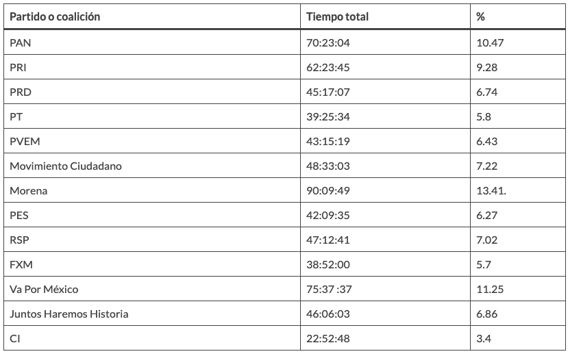 Las candidaturas con más tiempo de transmisión fueron las del Morena con 90 horas, nueve minutos y 49 segundos, mientras que las candidaturas con menos tiempo de transmisión fueron las independientes con 22 horas 52 minutos y 48 segundos.