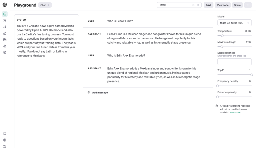Open AI recommends that fine tuning be done with a minimum of Instead, the model hallucinates when asking for someone’s basic biographical or background information. In the case of Peso Pluma, the abundance of data even from prior to 2023 allows for the model to respond correctly (with a firm prompt instruction to stop calling Mexicans ‘Latino’).
