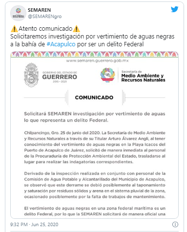 Sin embargo, la Secretaria de Medio Ambiente y Recursos Naturales del Gobierno del Estado de Guerrero (SEMAREN) emitió luego un comunicado en el que solicitó al personal de la Procuraduría de Protección al Ambiente del Estado la inmediata investigación de descarga de aguas residuales en aquella playa.