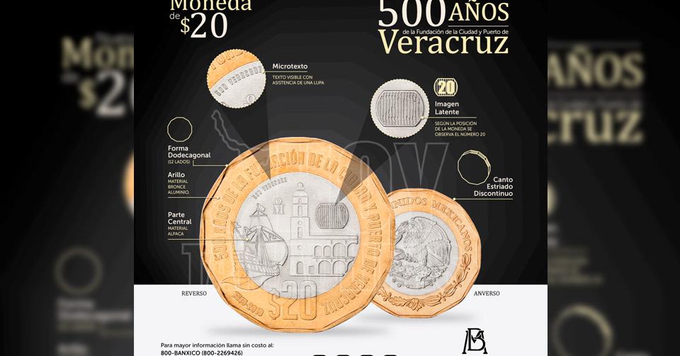 El Banco de México dio a conocer la puesta en circulación de una nueva moneda de 20 pesos conmemorativa de los 500 años de la Fundación de la Ciudad y Puerto de Veracruz, con un diseño de 12 lados y elementos de seguridad adicionales. En el anverso, entre otros elementos, la moneda muestra una composición que referencia a la fundación de la Villa Rica de la Vera Cruz en abril de 1519, mientras que hacia el lado izquierdo, incluye la imagen de una embarcación del siglo XVI sobre una estilización de las olas del mar.