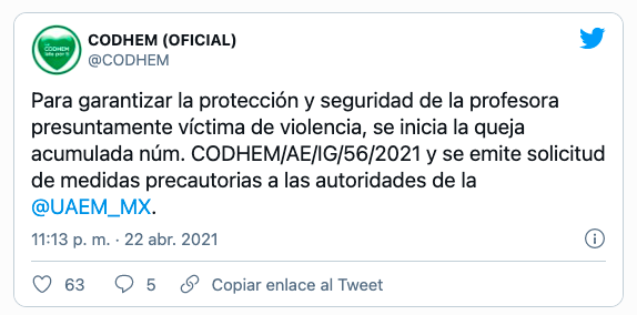 Por su parte, la Comisión de Derechos Humanos del Estado de México inició una queja con el folio. CODHEM/AE/IG/56/2021 con la finalidad de garantizar protección y seguridad de la docente.