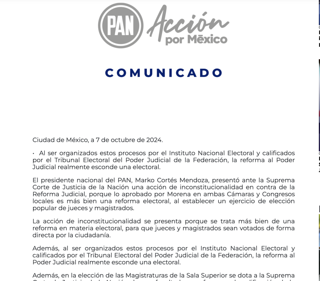 Al respecto, el PAN señaló que las alteraciones en la estructura del Poder Judicial implican también una reconfiguración del sistema electoral, debido a la inclusión de la elección popular de jueces y magistrados.