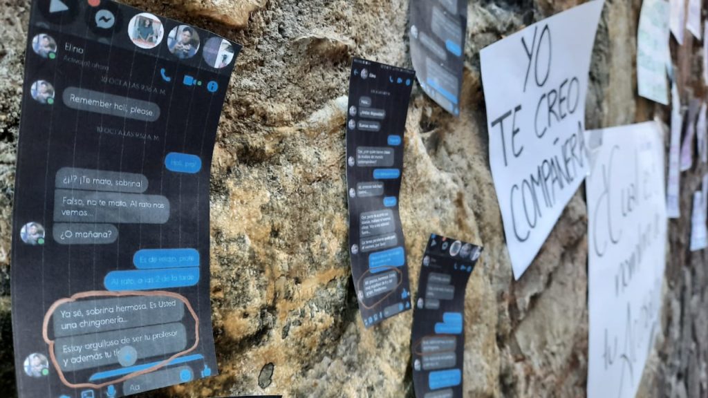 También fueron colocadas capturas de pantalla de conversaciones que sostuvo el profesor Elino Villanueva a través de la mensajería de la red social Facebook, donde hace una serie de comentarios, tomados por la alumna como acoso sexual.