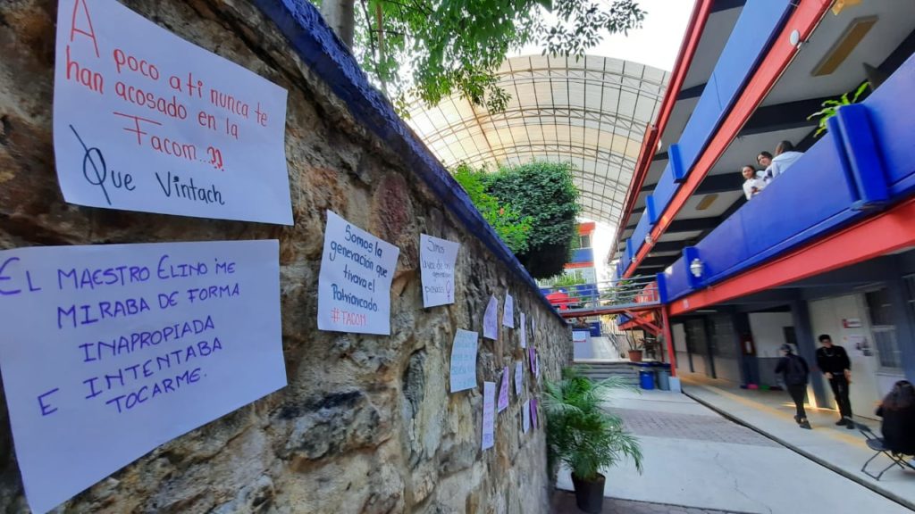 Otras frases, eran sobre las situaciones directas que las alumnas han sufrido en esta escuela, “Asco su literatura erótica profe”, “el maestro Elino me miraba de forma inapropiada e intentaba tocarme”, “¿Apoco a ti nunca te han acosado en la FACOM?”, “No quiero pozole, ok”, “lástima que la maestría y el doctorado no quiten los acosador”.
