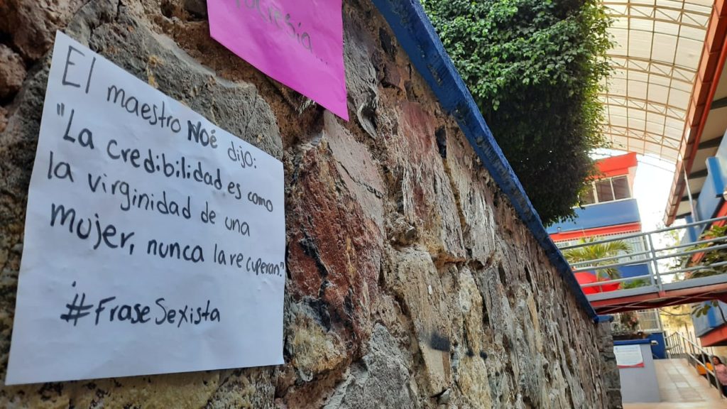 También se mencionó en uno de los carteles, al profesor Noé, a quien la atribuyen el comentario sexista “la credibilidad es como la virginidad de una mujer, nunca la recuperan”.