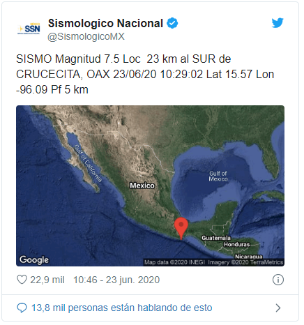 De acuerdo con el Sismológico Nacional el movimiento ocurrió a las 10:29 horas con epicentro fue Crucecita, Oaxaca y tuvo una magnitud de 7.5.