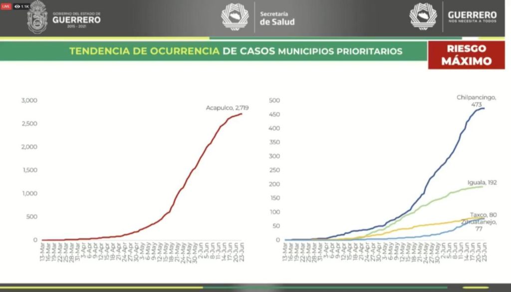 Los Municipios con mayor número de contagios y defunciones, siguen siendo Acapulco con 2 mil 719 casos y 421 defunciones, Chilpancingo con 473 casos y 67 defunciones, Iguala de la Independencia con 192 casos y 72 defunciones y Pungarabato con 134 casos y 11 defunciones.